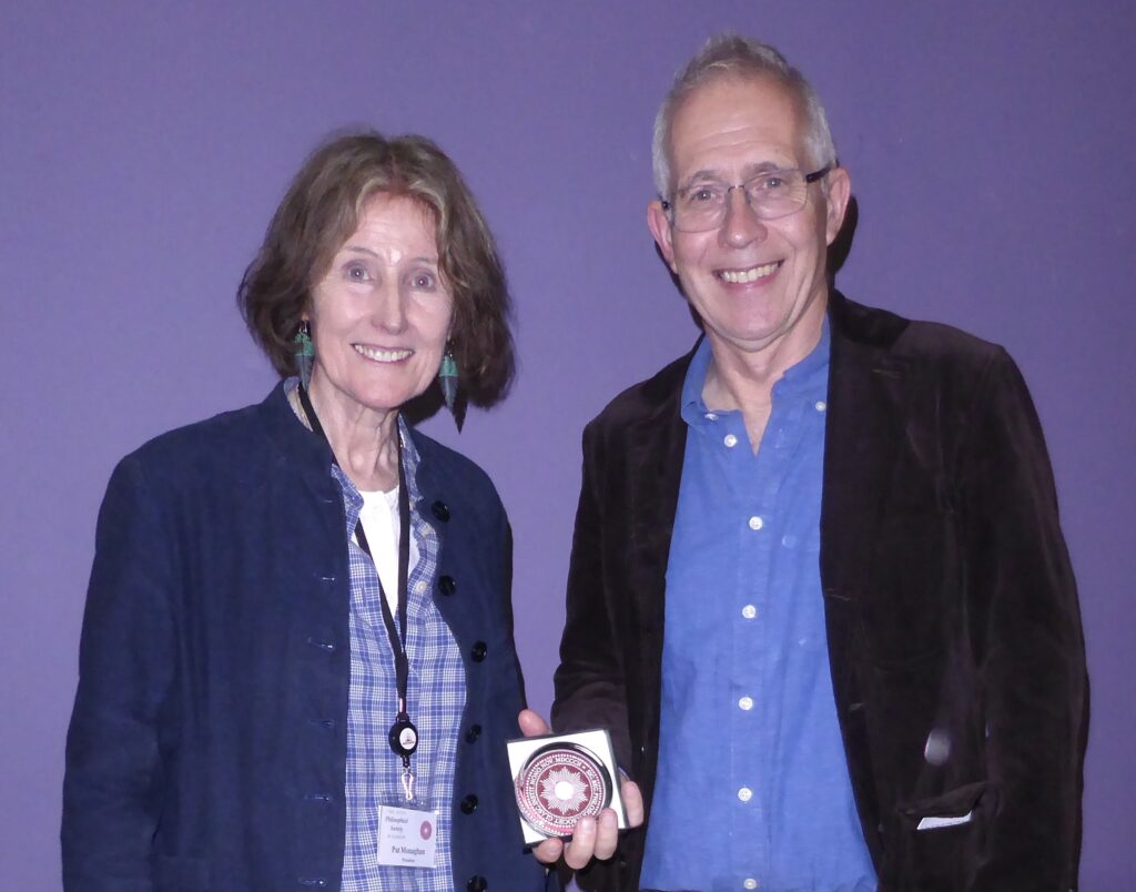 Professor Jim Smith receiving an RPSG paperweight from President Pat Monaghan